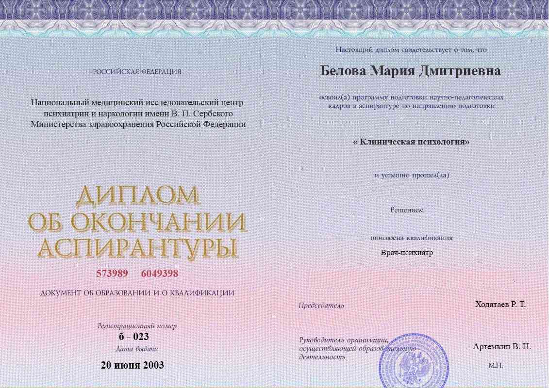 В 2003 окончила - Аспирантура в Национальном медицинском исследовательском центре психиатрии и наркологии им. В.П. Сербского