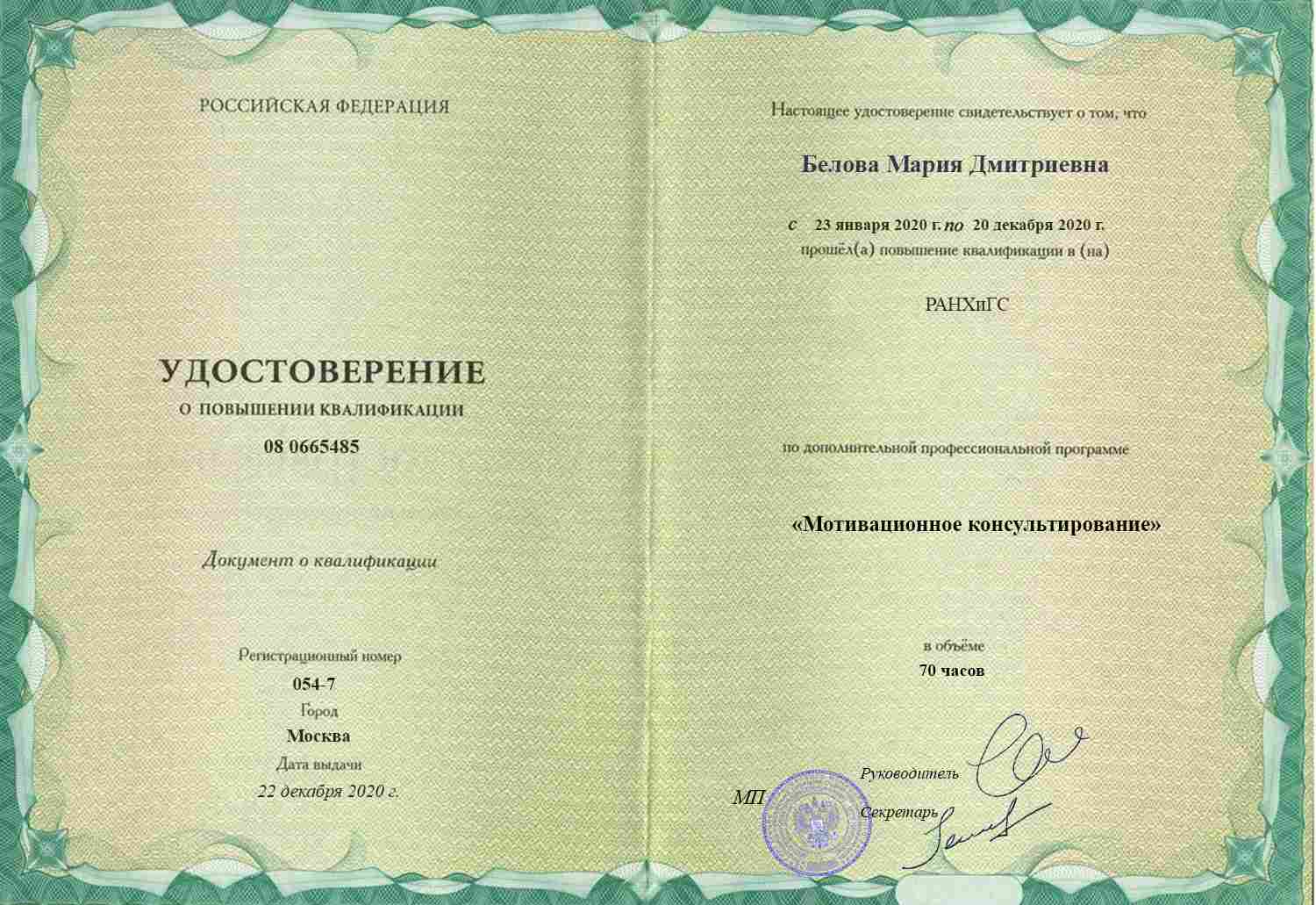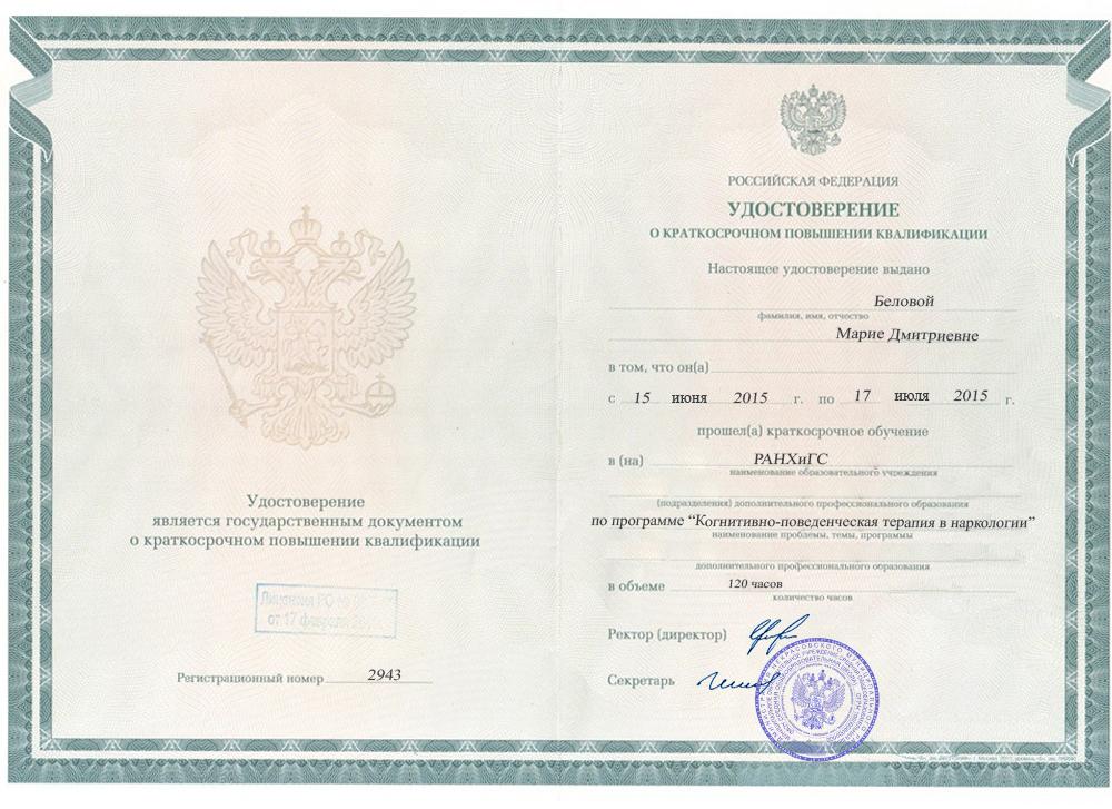 - Повышение квалификации: «Когнитивно-поведенческая терапия в наркологии».