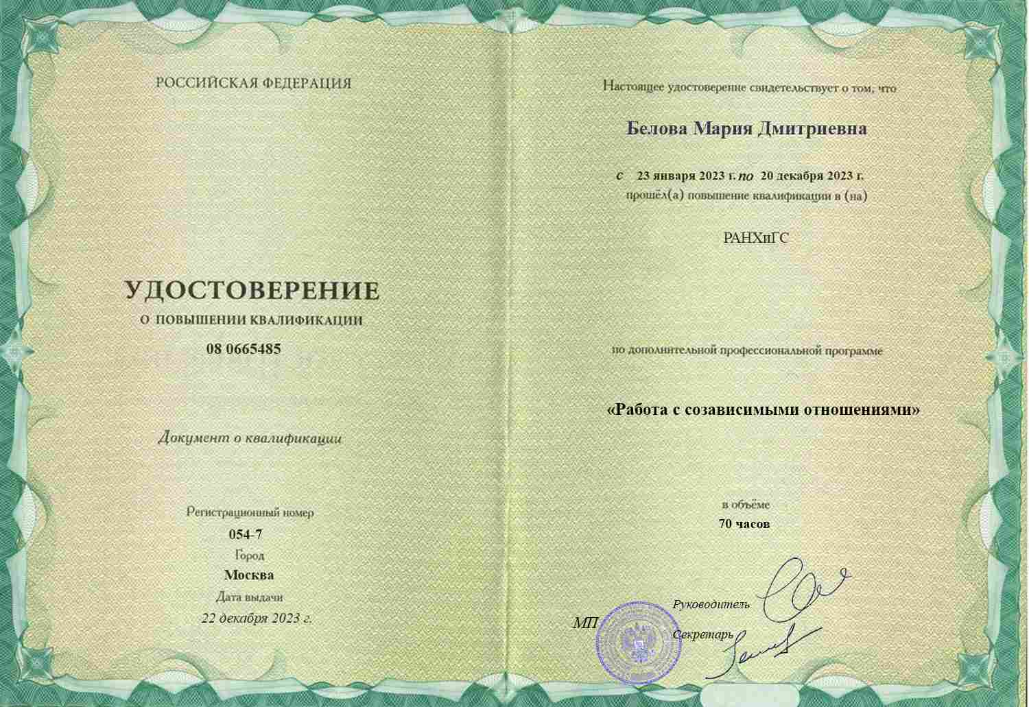 - Повышение квалификации: «Работа с созависимыми отношениями».